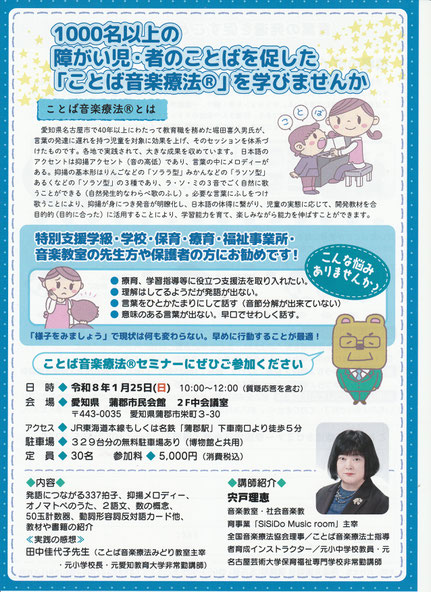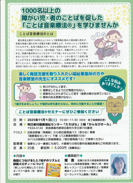 幼児期から学童期にかけて習得する言語能力は、その後の成長段階の学習成果に直結します。実際、障害児の療育や教育の現場では、児童のことば(発語・言語理解)の障害のために指導が思うように進んでいないのが現実です。ことばの音楽療法は、1音節の発語から2語文・3語文、そして知育までが療育が可能な指導法で、四半世紀にわたる愛知県での実践で大きな成果を示しました。ことばの障害を持った児童が次々と自らの発語で意思を表現できるようになり、これまでに約500人もの方々が今は社会でより自立度の高い人生を送っています。ことばに難を抱える児童がいらっしゃれば、ぜひご検討ください
